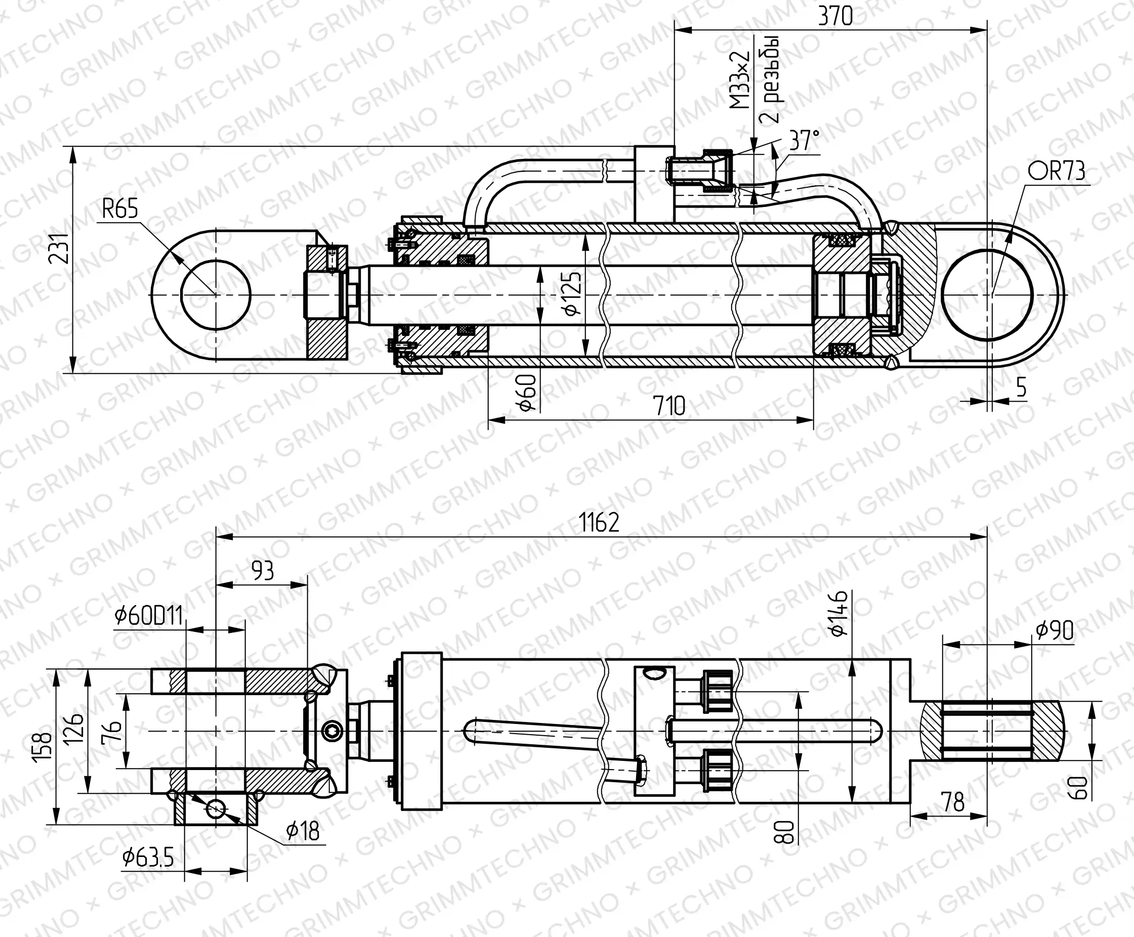 Максимальная нагрузка: толкающая 19 тонн, тянущая 16,14 тонн. Диаметр гильзы: 125 мм Диаметр штока: 60 мм Ход гидроцилиндра: 710 мм Установочный размер: 1160 мм Максимальное рабочее давление: 200 бар Вес: 81,9 кг
