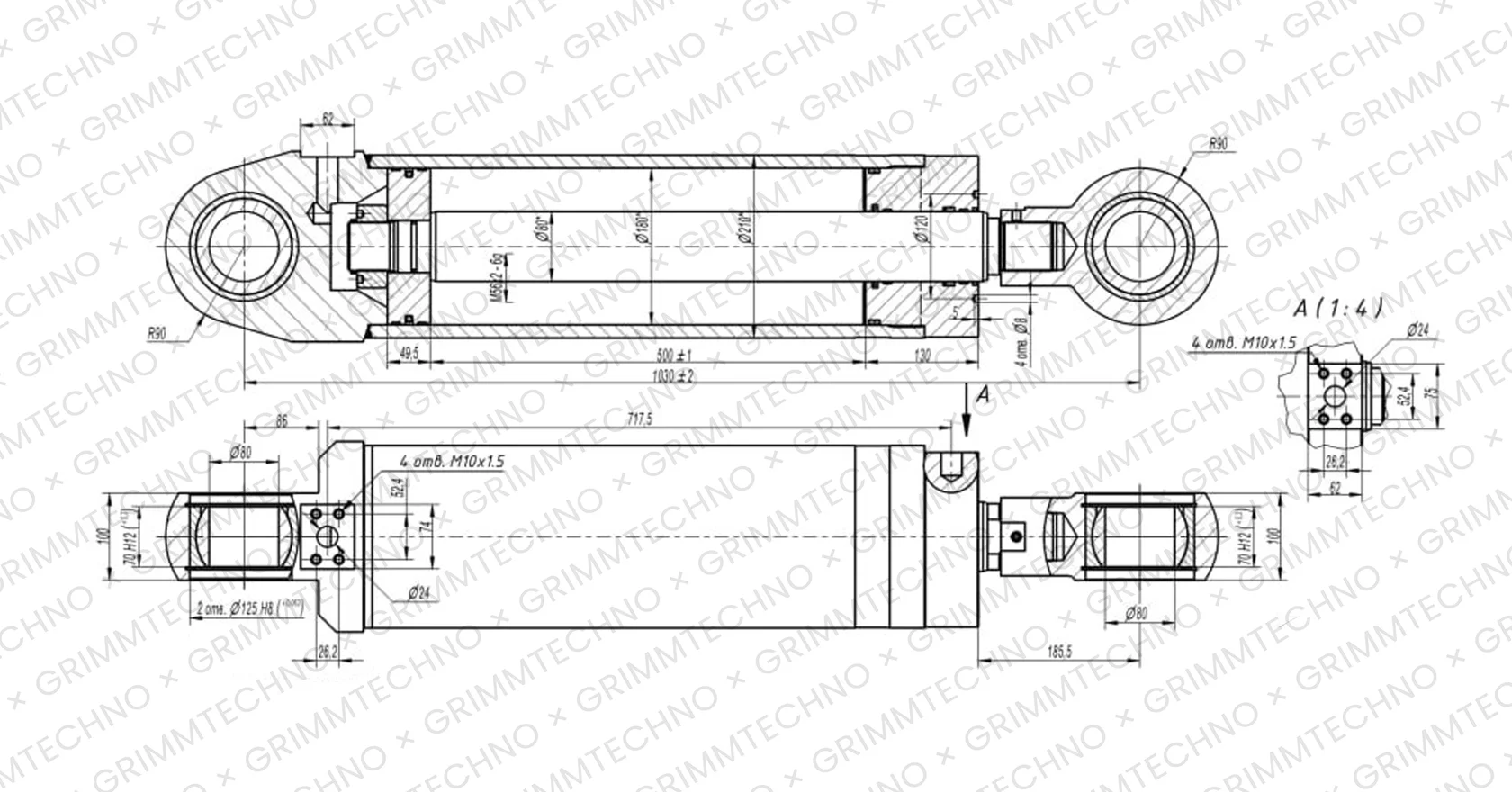 Максимальная нагрузка: толкающая 49,3 тонн, тянущая 39,56 тонн. Диаметр гильзы: 180 мм Диаметр штока: 80 мм Ход гидроцилиндра: 500 мм Установочный размер: 1030 мм Максимальное рабочее давление: 250 бар Вес: 177,6 кг