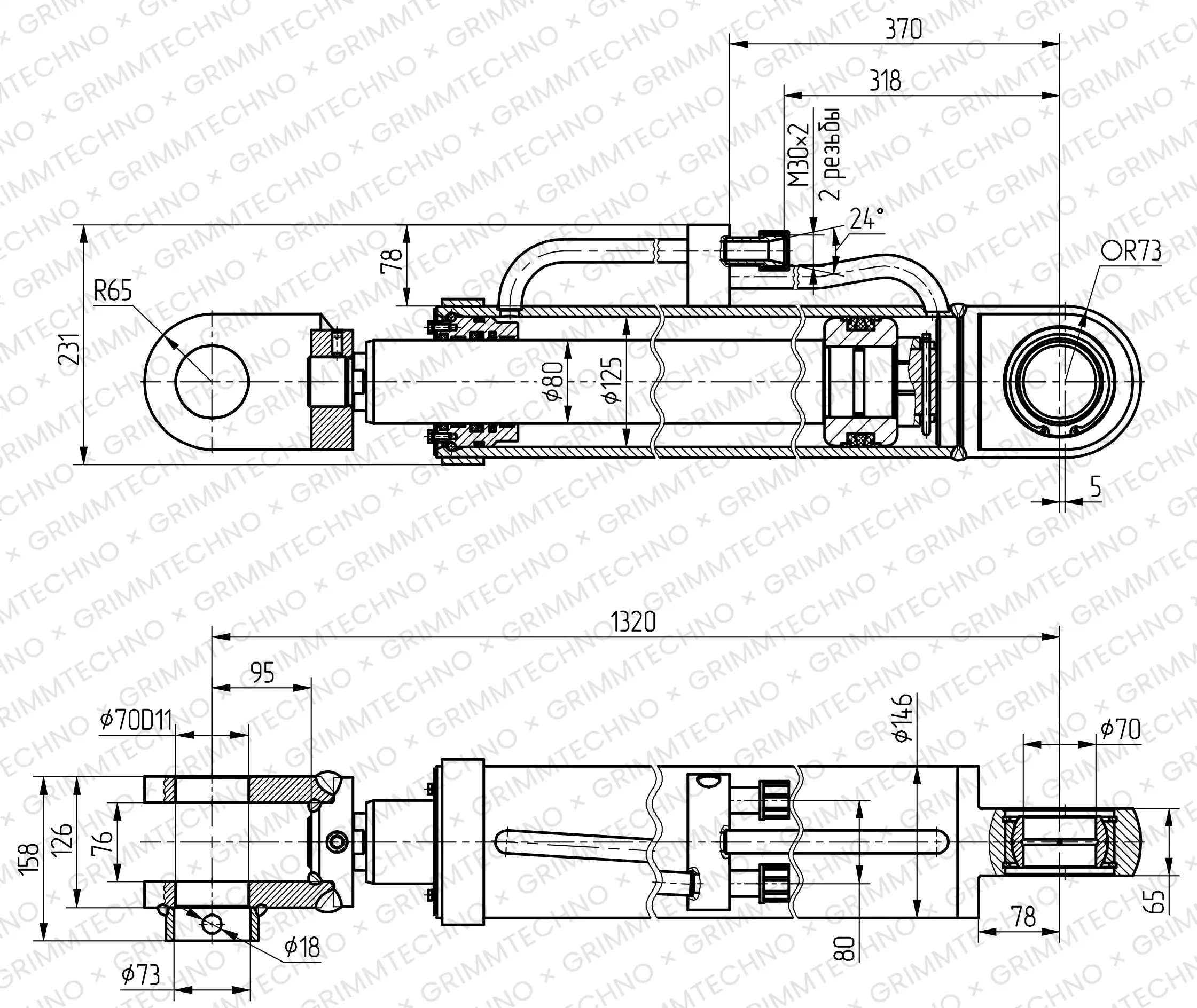 Максимальная нагрузка: толкающая 19 тонн, тянущая 13 тонн. Диаметр гильзы: 125 мм Диаметр штока: 80 мм Ход гидроцилиндра: 800 мм Установочный размер: 1320 мм Максимальное рабочее давление: 200 бар Вес: 105,8 кг