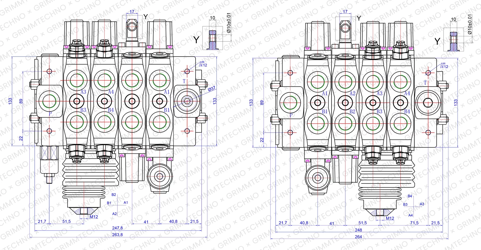 - Модульная конструкция: позволяет добавлять или убирать секции, клапана, менять тип управления золотниками (тросовое, ручное, управление через тяги), адаптируя гидрораспределитель под конкретные задачи и требования заказчика. Высокая ремонтопригодность: в наличии запчасти для постгарантийного обслуживания/ремонта.