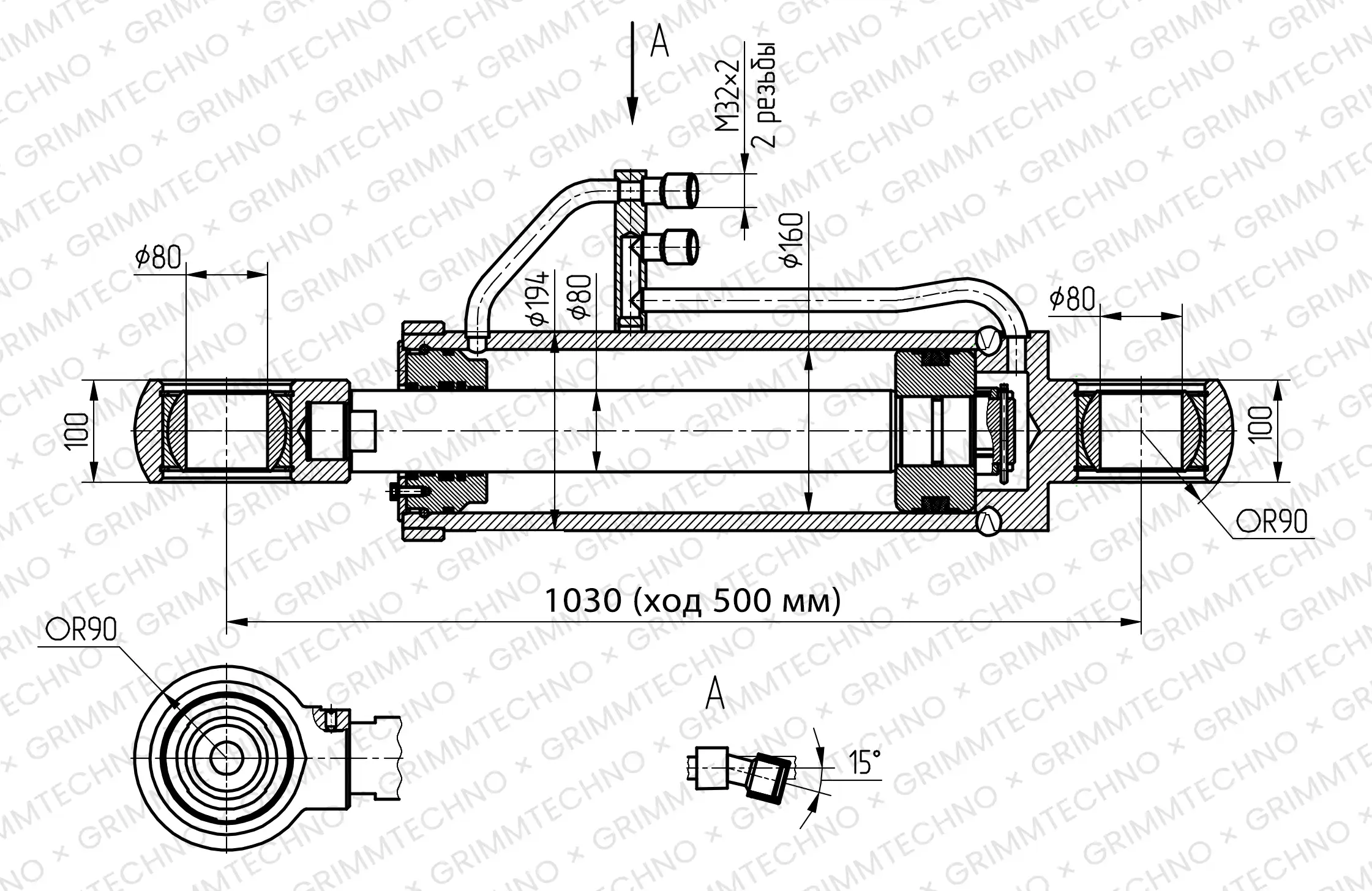 Максимальная нагрузка: толкающая 31,16 тонн, тянущая 23,37 тонн. Диаметр гильзы: 160 мм Диаметр штока: 80 мм Ход гидроцилиндра: 500 мм Установочный размер: 1030 мм Максимальное рабочее давление: 200 бар Вес: 154,2 кг
