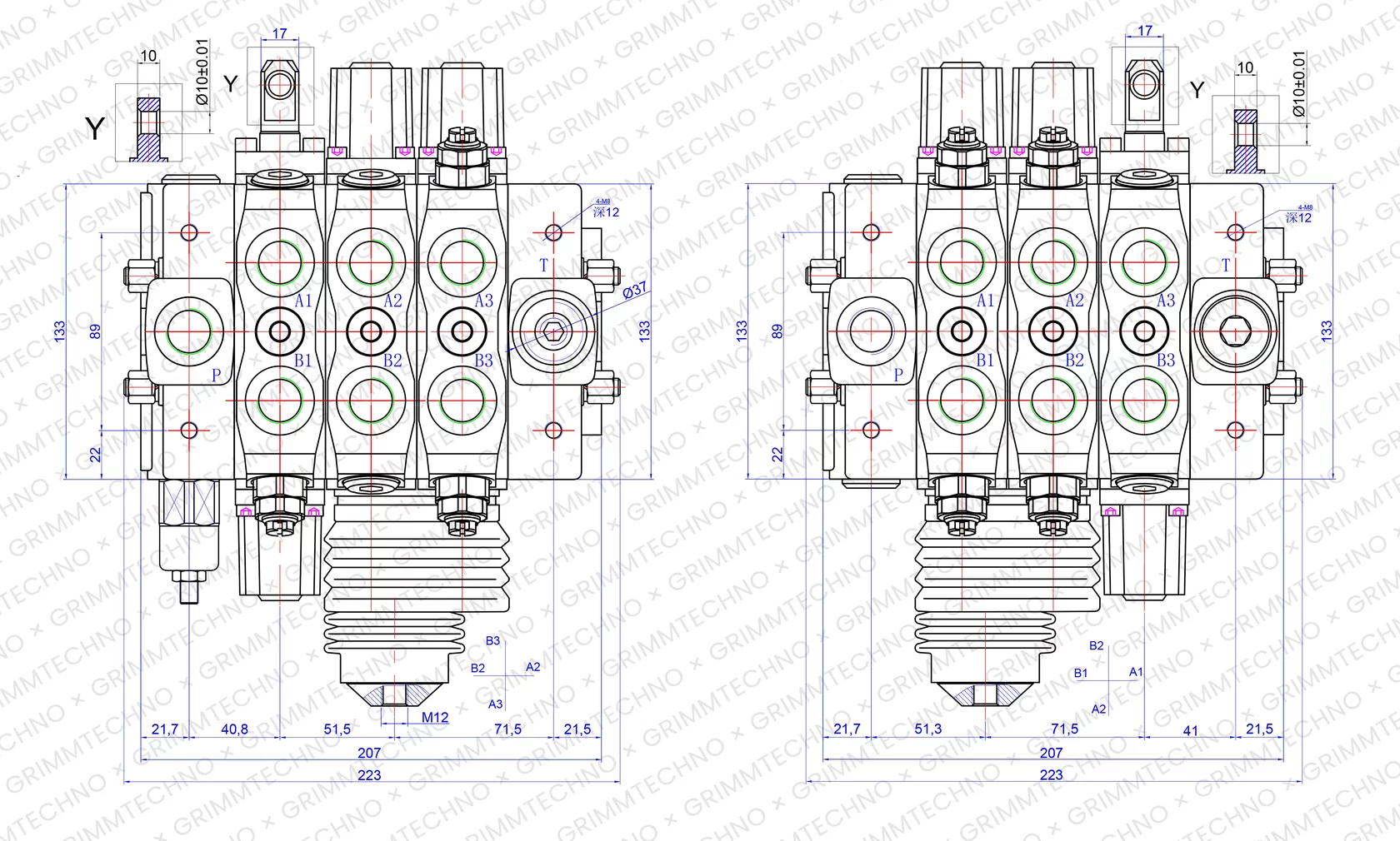 - Модульная конструкция: позволяет добавлять или убирать секции, клапана, менять тип управления золотниками (тросовое, ручное, управление через тяги), адаптируя гидрораспределитель под конкретные задачи и требования заказчика. Высокая ремонтопригодность: в наличии запчасти для постгарантийного обслуживания/ремонта.
